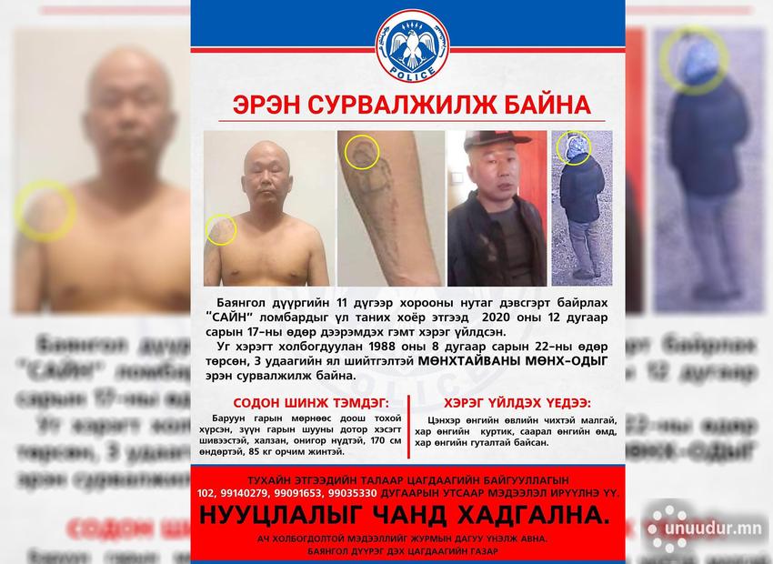 Дөрвөн удаа ял шийтгүүлсэн, маш ноцтой гэмт хэрэгтнийг Монгол Улс даяар эрэн сурвалжилж байна. Тодруулбал, Мөнхтайван овогтой Мөнх-Од арванхоёрдугаар сарын 17-нд “Сайн” барьцаалан зээлдүүлэх газрыг бусадтай бүлэглэн дээрэмдээд зугтсан аж. Эрэн сурвалжлагдаж буй эл этгээд өнгөрсөн гуравдугаар сард Баянзүрх дүүргийн “Да хүрээ” авто худалдааны төвийн ойролцоох “Сайн” болон Сүхбаатар дүүрэгт байрлах “Бан Бан” ломбардыг мөн тоножээ.