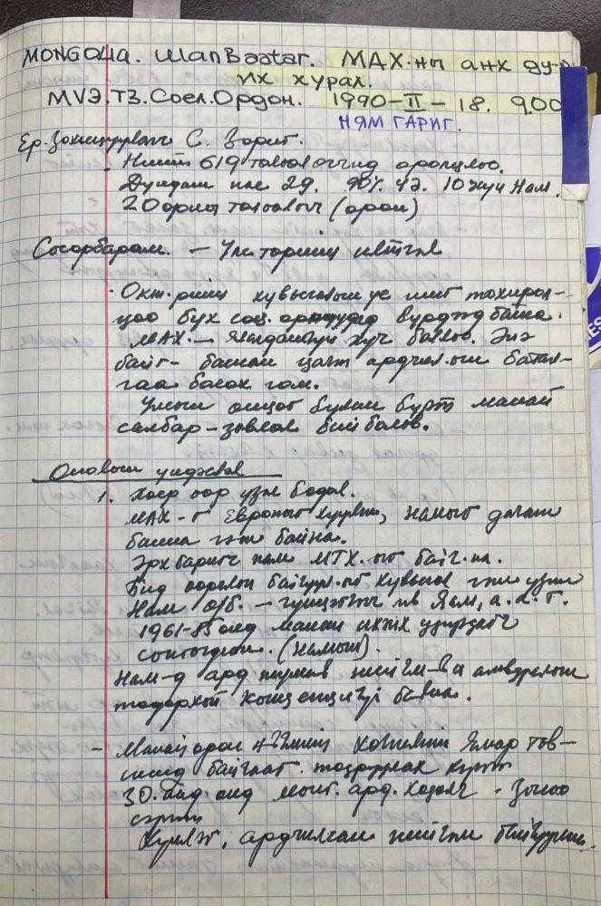 1990 оны 2-р сарын 18-нд Монголын үйлдвэрчний эвлэлийн Соёлын Ордонд Монголын Ардчилсан Холбооны (МАХ) анхдугаар их хуралд би сууж, хувийн тэмдэглэл хөтөлсөн. Москвагийн Их сургуулийн анд С.Зориг нээж, Д.Сосорбарам “улс төрийн илтгэл” тавьж билээ. Илтгэлд “МАХ-нь социализмийг капитализмаас илүү сайн нийгэм гэж үздэг. Хөдөлмөрийн бүтээмжээ л өсгөх шаардлагатай. …4 аймаг, 2 хоттой байх… өмчийн олон хэлбэрийг бүрдүүлнэ… марксизмыг бүтээлчээр арвижуулна…” гэх зэргээр дүгнэж билээ.