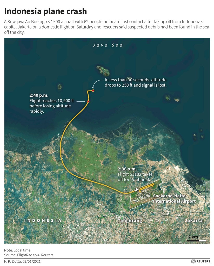 Sriwijaya Air компанийн агаарын хөлөг Баруун Калимантан мужийн Понтианак руу 62 хүн тээвэрлэж явсан ба хөөрснөөс хойш дөрвөн минутын дараа радараас алга болжээ. Осол болсон байршил руу шумбагчдыг тээвэрлэсэн 10 гаруй усан онгоцыг илгээгээд байна. Мөн онгоцны эд анги байж болох зүйлсийг шинжээчид олж, шинжилж байгаа аж.